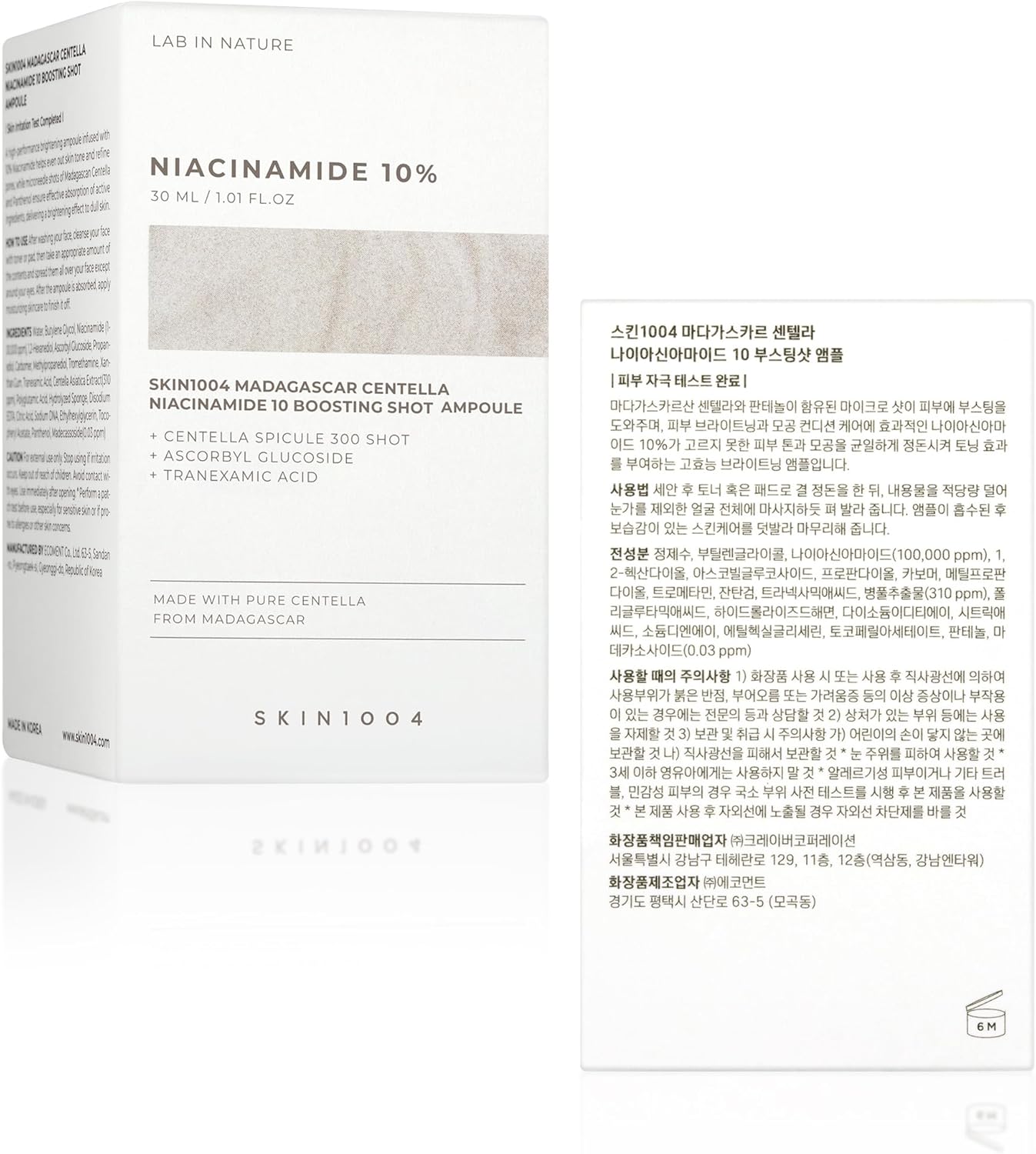 آمپول نیاسینامید 10 درصد سنتلا یکی از محصولات جدید خط تولید LAB IN NATURE برند کرهای SKIN1004 است که در سال ۲۰۲۵ معرفی شده است. این محصول به عنوان یک آمپول با کارایی بالا طراحی شده و بر پایه سیستم “Boosting Shot” عمل میکند. این سیستم از اسپوکولهای میکرو (میکروسکوپیک، با اندازه متوسط ۱۳ میکرومتر – کوچکتر از اندازه متوسط منافذ پوست) برای ایجاد مسیرهای جذب استفاده میکند تا مواد فعال را عمیقتر به لایههای پوست برساند. این آمپول برای پوستهای حساس مناسب است و تستهای تحریک پوستی را با موفقیت پشت سر گذاشته (هیپوآلرژیک).