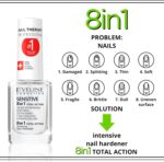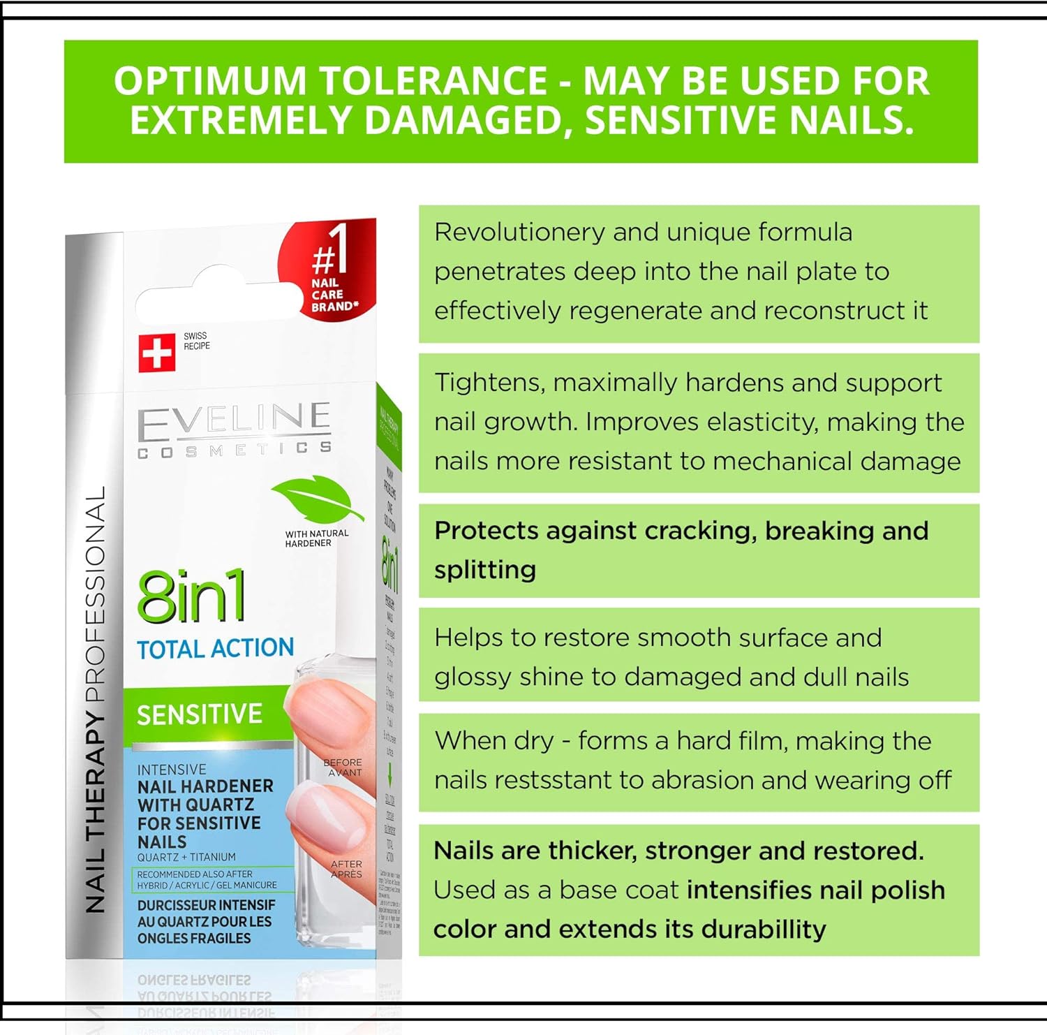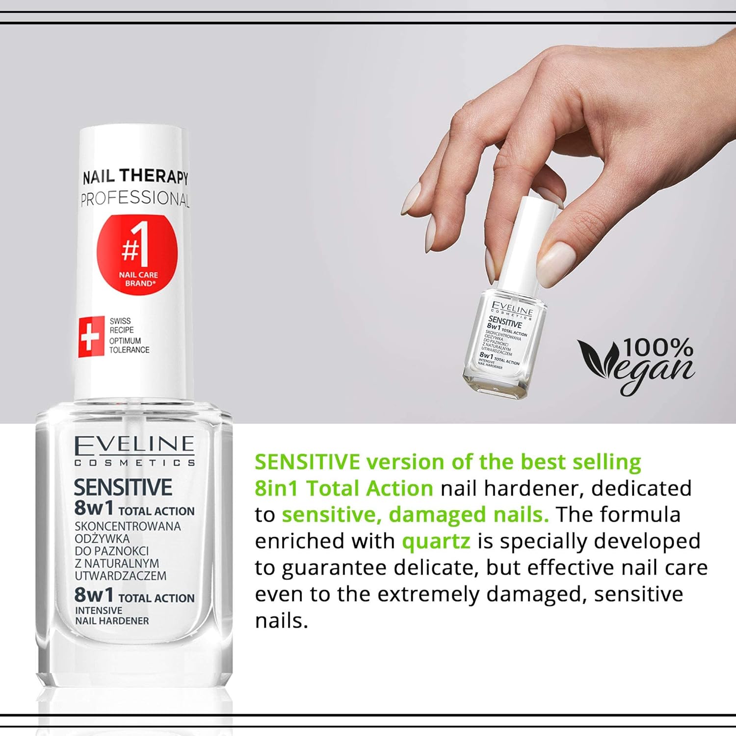 تقویت کننده 8 در 1 ناخن های حساس اولاین از برند محبوب Eveline Cosmetics، یک تقویتکننده چندمنظوره برای ناخنهای حساس، آسیبدیده و شکننده است. نسخه “Sensitive” آن بر پایه فرمول پرفروش 8in1 Total Action ساخته شده، اما با غنیسازی کوارتز (quartz) برای مراقبت ملایمتر و مؤثرتر طراحی شده است. این محصول به عنوان یک درمان فشرده عمل میکند و برای افرادی که ناخنهای ضعیف، حساس یا حساس به مواد شیمیایی مانند فرمالدئید دارند، ایدهآل است. حجم آن 12 میلیلیتر است و بدون تست حیوانی (cruelty-free) تولید میشود.