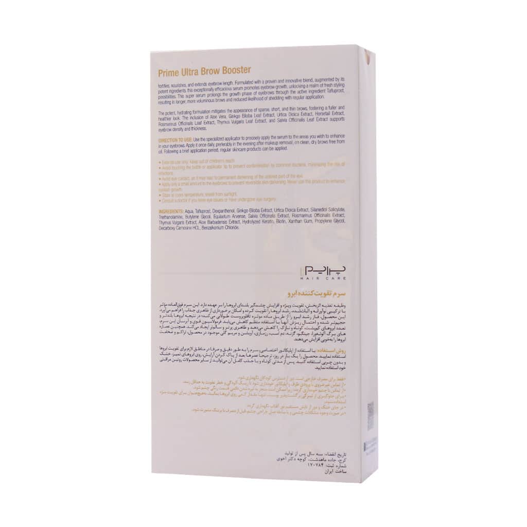 سرم تقویت کننده ابرو پرایم یک محصول با فرمولاسیون پیشرفته حاوی عصاره‌های گیاهی آلوئه ورا، جینگو بیلوبا، گزنه، دم اسب، رزماری، آویشن و مریم گلی و بیوتین است که به منظور تقویت رشد و پرپشت شدن ابروها طراحی شده است. این سرم فوق العاده موثر با ترکیبی نوآورانه و اثبات شده، رشد ابروها را تقویت کرده و امکان برخورداری از ظاهری جذاب را فراهم می‌آورد. استفاده مداوم از سرم تقویت کننده ابرو اولترا برو پرایم نه تنها موجب افزایش ضخامت و تراکم ابروها می‌شود، بلکه به جلوگیری از ریزش ابرو و ترمیم آسیب‌های ناشی از مواد شیمیایی یا اصلاح مداوم نیز کمک می‌کند.