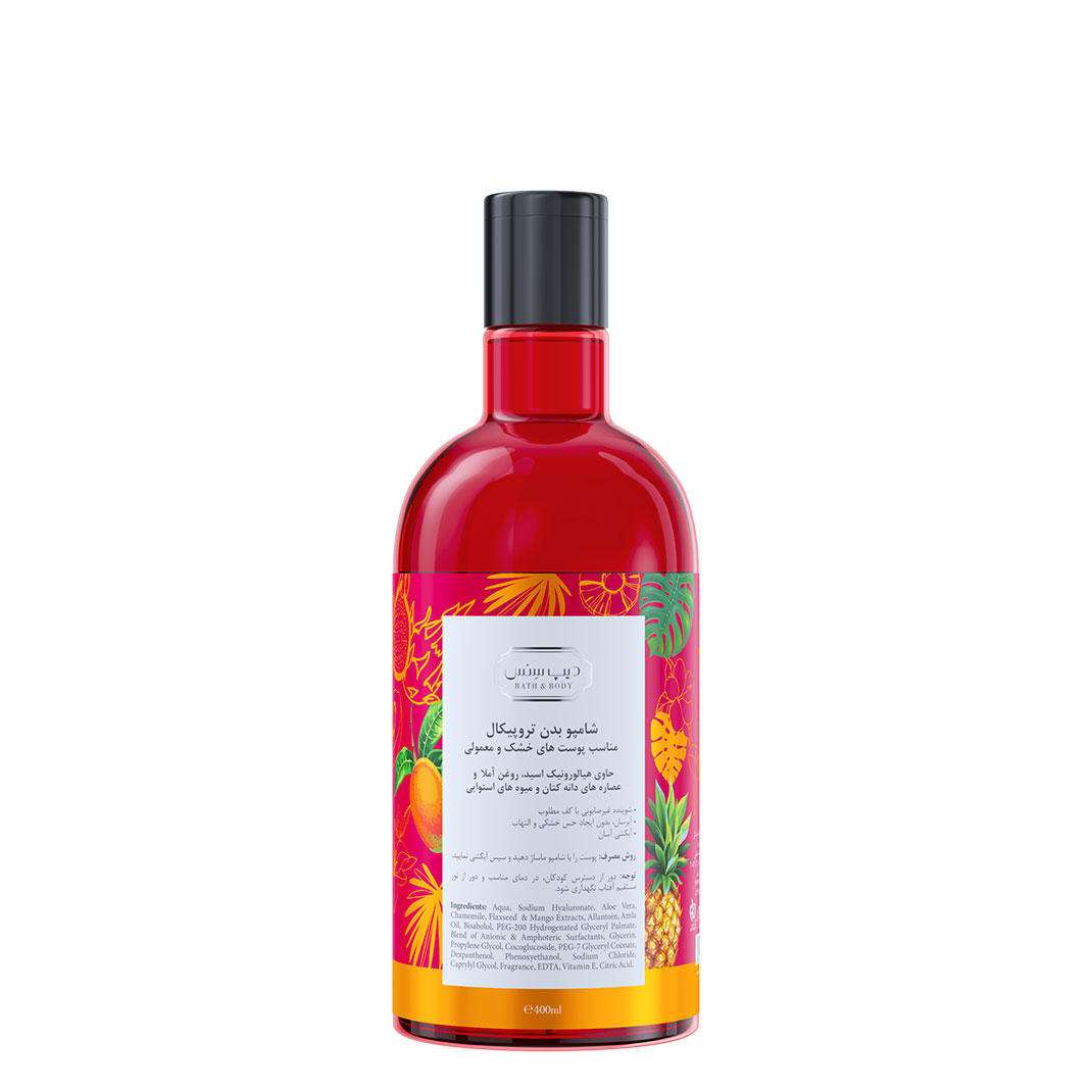 شامپو بدن تروپیکال دیپ سنس با فرمولاسیون ویژه خود، مناسب پوستهای خشک و خیلی خشک است. هیالورونیک اسید به عنوان آبرسان عمیق، رطوبت را به لایههای پوست میرساند و آن را مرطوب نگه میدارد. روغن آملا، غنی از آنتیاکسیدانها، از پوست در برابر عوامل محیطی محافظت کرده و آن را تغذیه میکند.