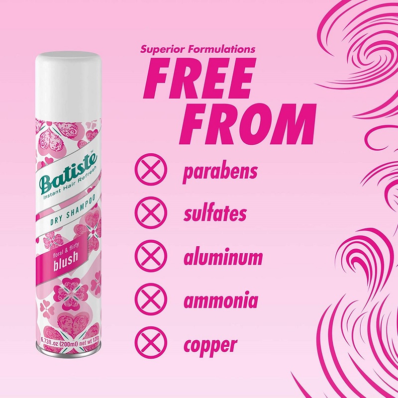 شامپو خشک باتیست مدل Blush مناسب افرادی است که زمان کافی برای شستشو و استحمام ندارند و از طرفی از ظاهر چرب موهای خود گله دارند و یا در مسافرت و کمپ به سر می برند و به آب دسترسی ندارند. این محصول نیازی به آبکشی ندارد و به سرعت موها را از آلودگی و چربی پاک می کند. استفاده از این محصول برای انواع مو مناسب میباشد و موجب نرمی و لطافت مو میشود. این محصول دارای بوی خوش گل سرخ، گل صدتومانی، گل فریزیا و پوست پرتقال است.