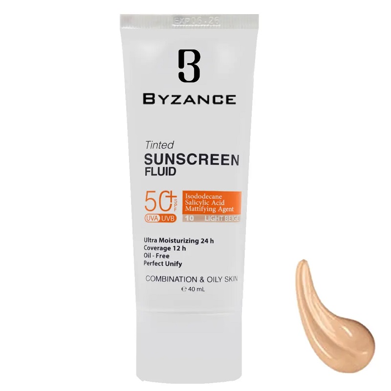 فلوئید ضد آفتاب رنگی SPF50 پوست چرب و مختلط بیزانس محصولی است که با فرمولاسیون ویژه خود، محافظت کاملی در برابر اشعه‌های مضر UVA و  UVB نور خورشید ارائه می‌دهد. این ضد آفتاب با فاکتور حفاظتی SPF50 خود برای پوست های چرب، مختلط و مستعد آکنه طراحی شده و به دلیل داشتن بافتی نرم و سبک و بدون ایجاد حس چربی به سرعت جذب پوست می‌ شود.