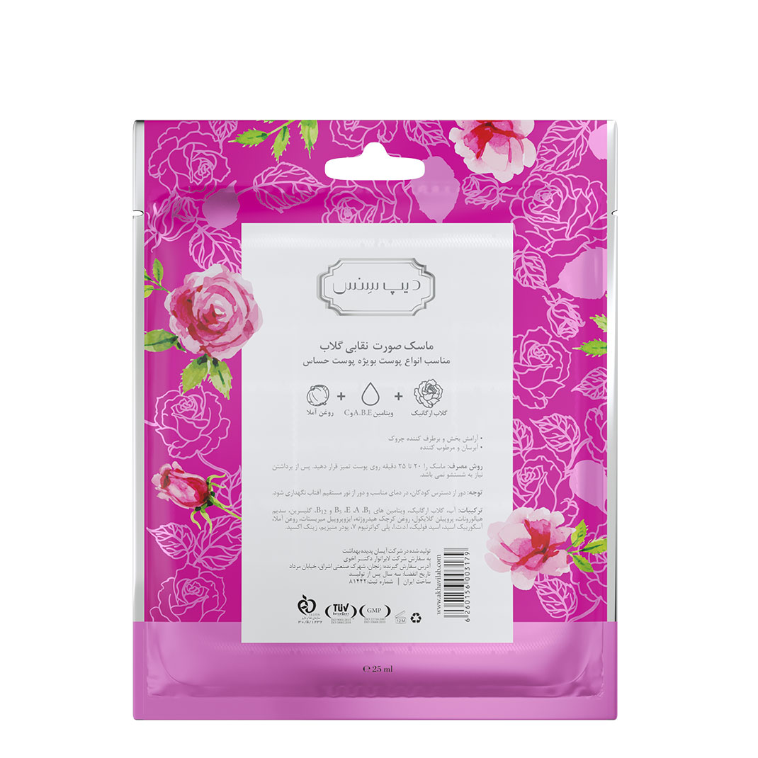 ماسک ورقهای گلاب طبیعی دیپ سنس با ترکیبی از مواد مغذی و آبرسان، انتخابی ایدهآل برای طراوت و تقویت پوست است. ویتامینهای A، B، E و C با خاصیت تقویتی و روشنکننده خود، به شادابی و جوانسازی پوست کمک میکنند. سدیم هیالورونات به حفظ رطوبت عمیق پوست و لطافت آن کمک کرده و روغن آملا با خاصیت آنتیاکسیدانی خود به تغذیه و درخشندگی پوست یاری میرساند.