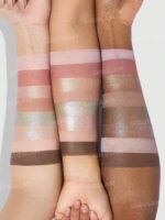 - تعداد رنگها و فرمولاسیون: شامل ۵ رنگ مات نرم (soft mattes) و ۳ رنگ شیمر درخشان (shimmer-soaked shades). رنگها به راحتی بلِند میشوند و برای آرایشهای ملایم یا پررنگ ایدهآل هستند. فرمول آن پودری-کرمی و ماندگار است و به پوست میچسبد.