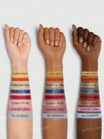 - تنوع رنگها و بافتها: این پالت شامل 9 رنگ متنوع است که ترکیبی از سایههای مات (Matte)، شیمری (Shimmer) و یک کرم شفاف براق (High-Shine Cream) را ارائه میدهد. رنگها شامل طیفهای پرجنبوجوش مانند صورتی، بنفش، زرد، نارنجی و آبی هستند که برای خلق آرایشهای جسورانه و خلاقانه مناسباند.