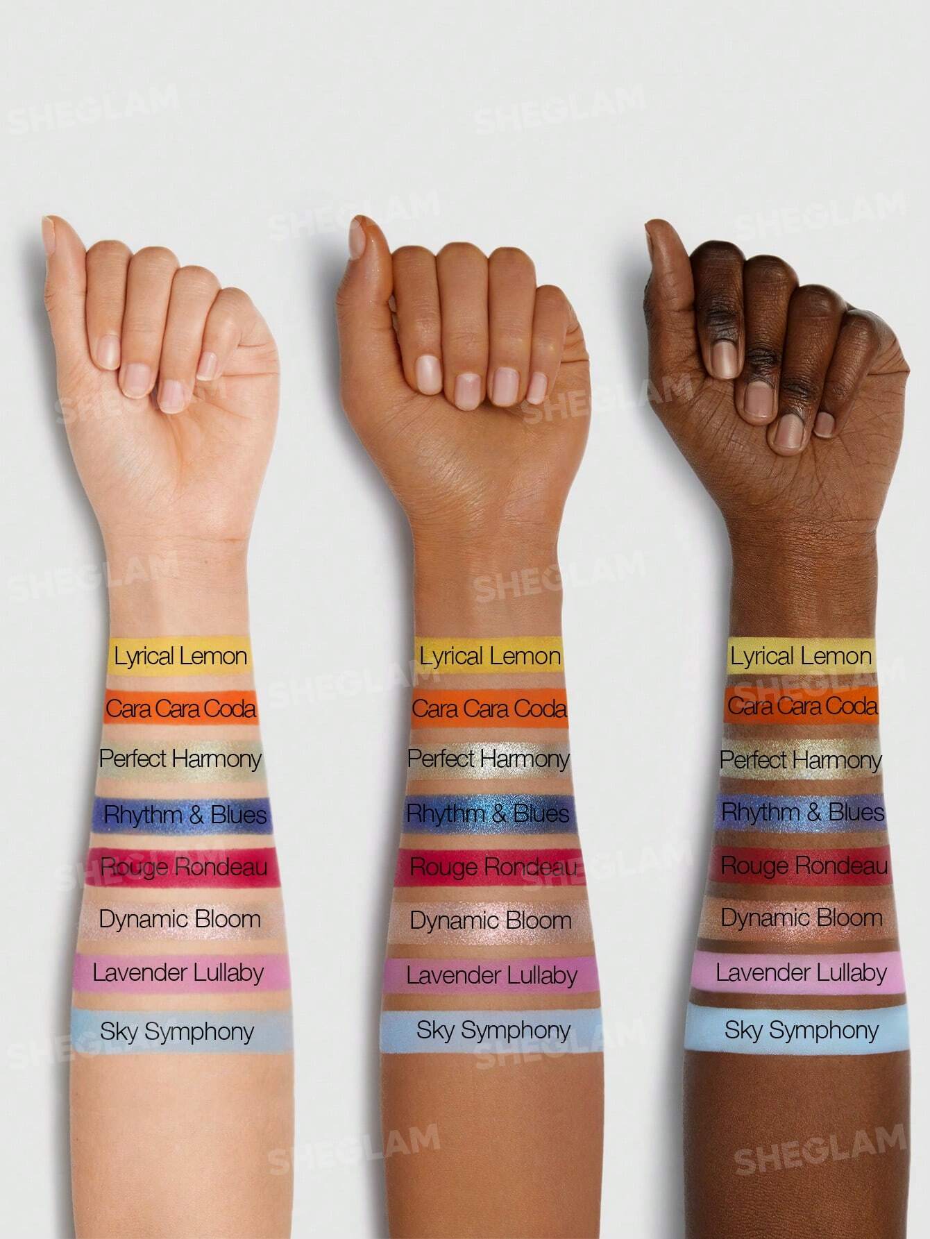 رنگهای این پالت شامل نامهایی مانند Lyrical Lemon (زرد لیمویی)، Sky Symphony (آبی آسمانی)، Cara Cara Coda (نارنجی)، Rouge Rondeau (قرمز)، Rhythm & Blues (آبی تیره شیمری)، Dynamic Bloom (صورتی شیمری) و Lavender Lullaby (بنفش) هستند. توجه داشته باشید که سه رنگ (Cara Cara Coda، Rouge Rondeau و Lavender Lullaby) برای استفاده در ناحیه اطراف چشم توصیه نمیشوند، به دلیل محدودیتهای قانونی در استفاده از برخی پیگمنتها برای ناحیه چشم، هرچند ایمن هستند.