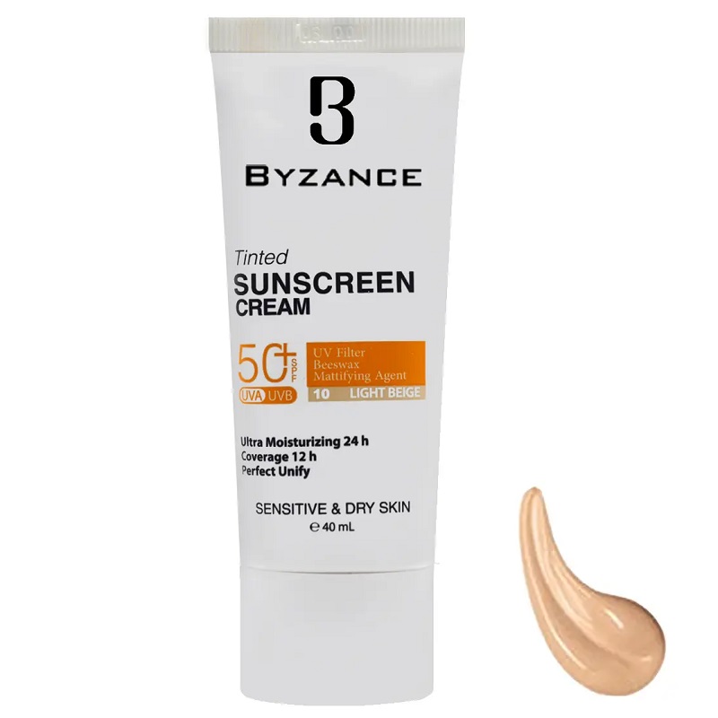کرم ضد آفتاب بیزانس برای پوست خشک دارای فاکتور حفاظتی spf50 است که به منظور حفاظت از پوست خشک و حساس در برابر آسیب های ناشی از پرتوهای UV خورشید و هم چنین، رادیکال های آزاد در سه رنگ بژ روشن، بژ طبیعی و بژ طلایی در بسته بندی تیوپ به حجم 40 میلی لیتر در ایران تولید می شود.