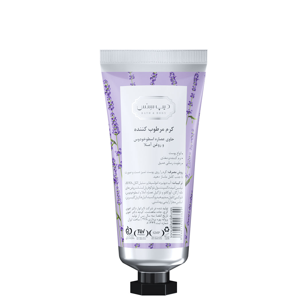 کرم مرطوبکننده دست و صورت لوندر دیپ سنس با ترکیبی از عصاره اسطوخدوس، روغن آووکادو، شی باتر، روغن نارگیل، روغن آرگان، نیاسین آمید و دکسپانتنول، پوست را تغذیه و عمیقاً آبرسانی میکند. عصاره اسطوخدوس با خاصیت آرامشبخش خود، التهابات را کاهش میدهد، در حالی که روغنهای آووکادو، نارگیل و آرگان و شی باتر پوست را نرم و لطیف میسازند. نیاسین آمید به روشنکنندگی و دکسپانتنول به ترمیم و حفظ رطوبت پوست کمک میکنند.